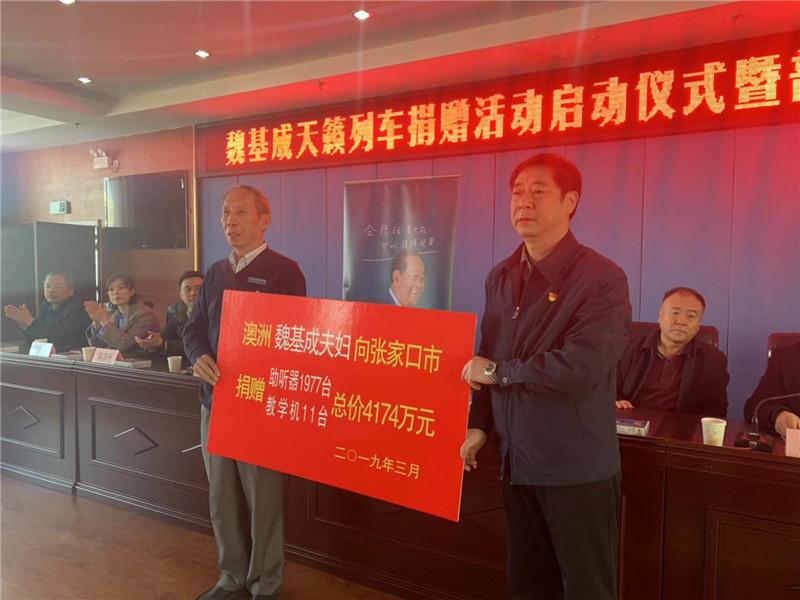 澳大利亞魏基成“天籟列車”河北慈善捐贈活動自2018年5月3日在邯鄲市啟動,至2019年11月16日在定州市結束,歷時一年半時間,走遍全省11個設區市及辛集、定州和雄安新區(150余個縣區)和119所特校,基本實現了全省覆蓋;為全省聽障人士無償捐贈藍牙、骨感助聽器16200余臺,為特教學校捐贈語音教學機119臺,市場價值約3.4億元。